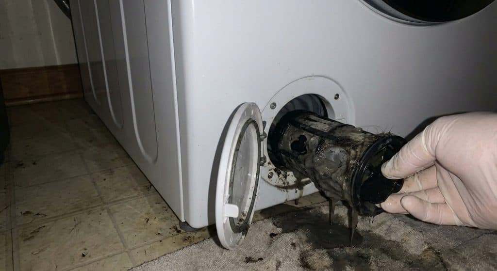 Usually located on the bottom front panel, there is a drain pump filter that catches hair, coins, and lint. If you don’t clean it, the water rots in there.