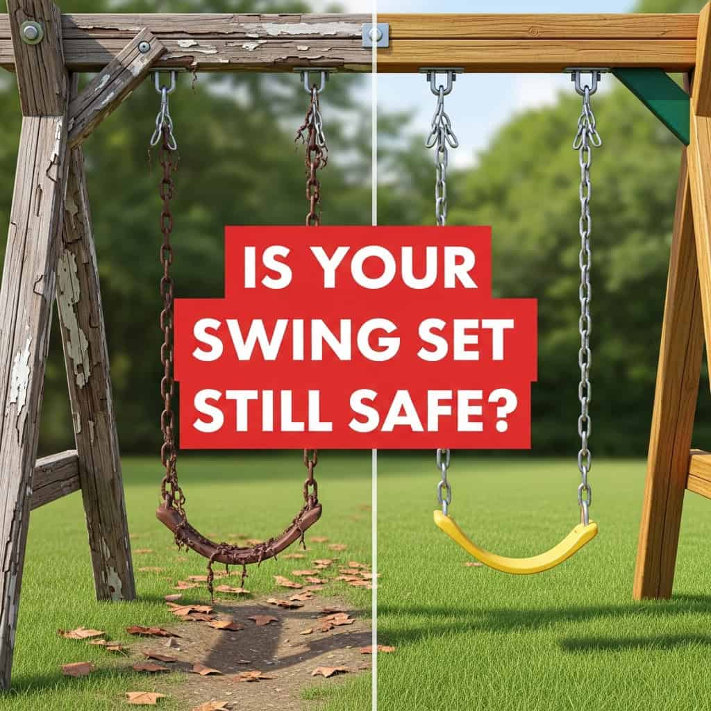- Replace any cracked swing seats or worn chains — safety comes first.