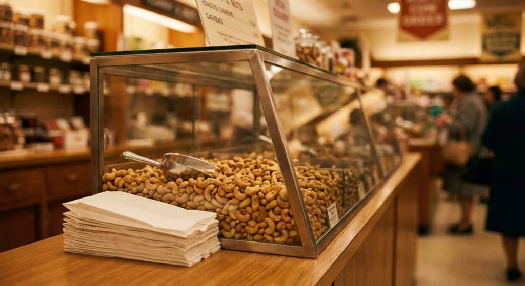 • The Candy & Nut Counter: Many stores had a dedicated kiosk near the entrance. You knew you were being good if your mother finally stopped to buy a small white paper bag of warm cashews or a box of Fannie May candies.