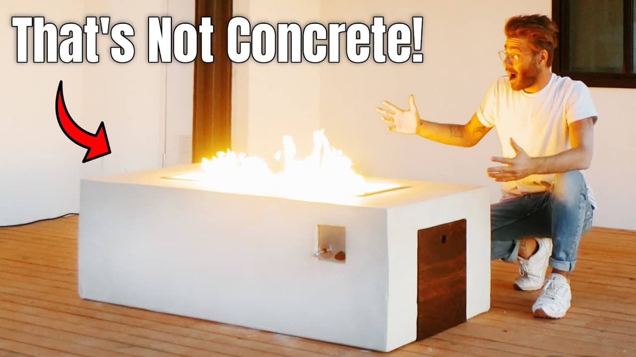 This is a low‑profile outdoor coffee table that mimics a white concrete finish while staying hollow and portable by using a wooden frame wrapped in cement board and coated with thinset mortar.