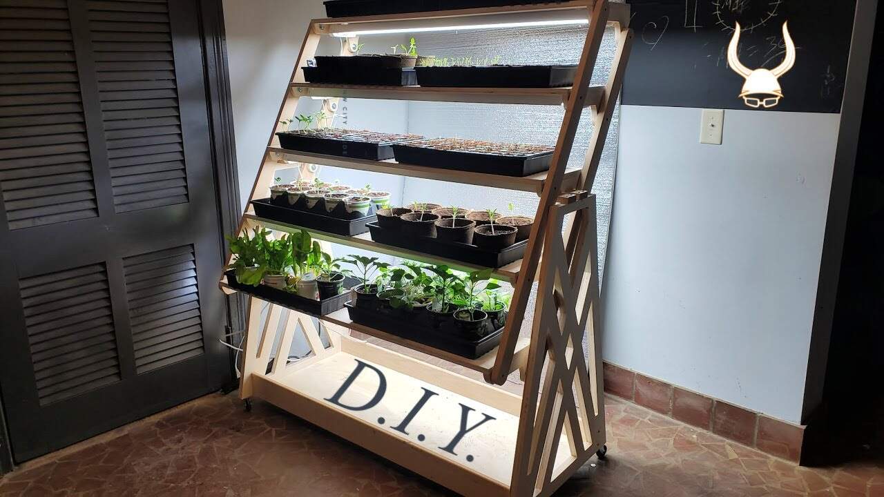 Izzy repurposes a classic folding bookcase table into a compact indoor garden designed for seed propagation and microgreens.