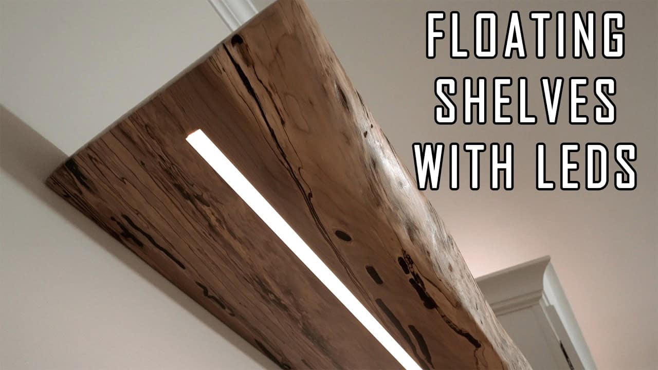 It features a set of custom floating shelves made from live-edge slabs, complete with epoxy-filled voids, hidden brackets, and integrated LED lighting for a clean, modern finish.