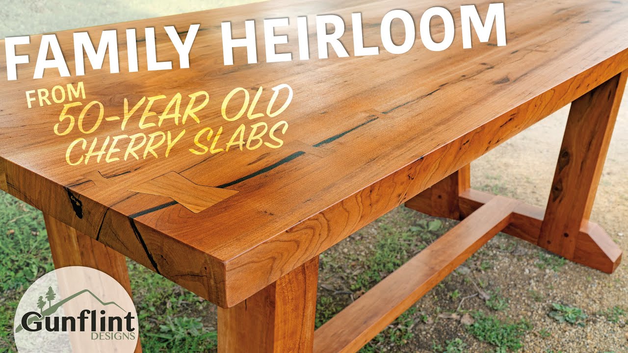 This project was built and designed by Mark from Gunflint Designs. It’s a meaningful build using heirloom cherry slabs and features elegant butterfly inlays and epoxy-filled cracks to bring both structure and style to a trestle-style dining table.