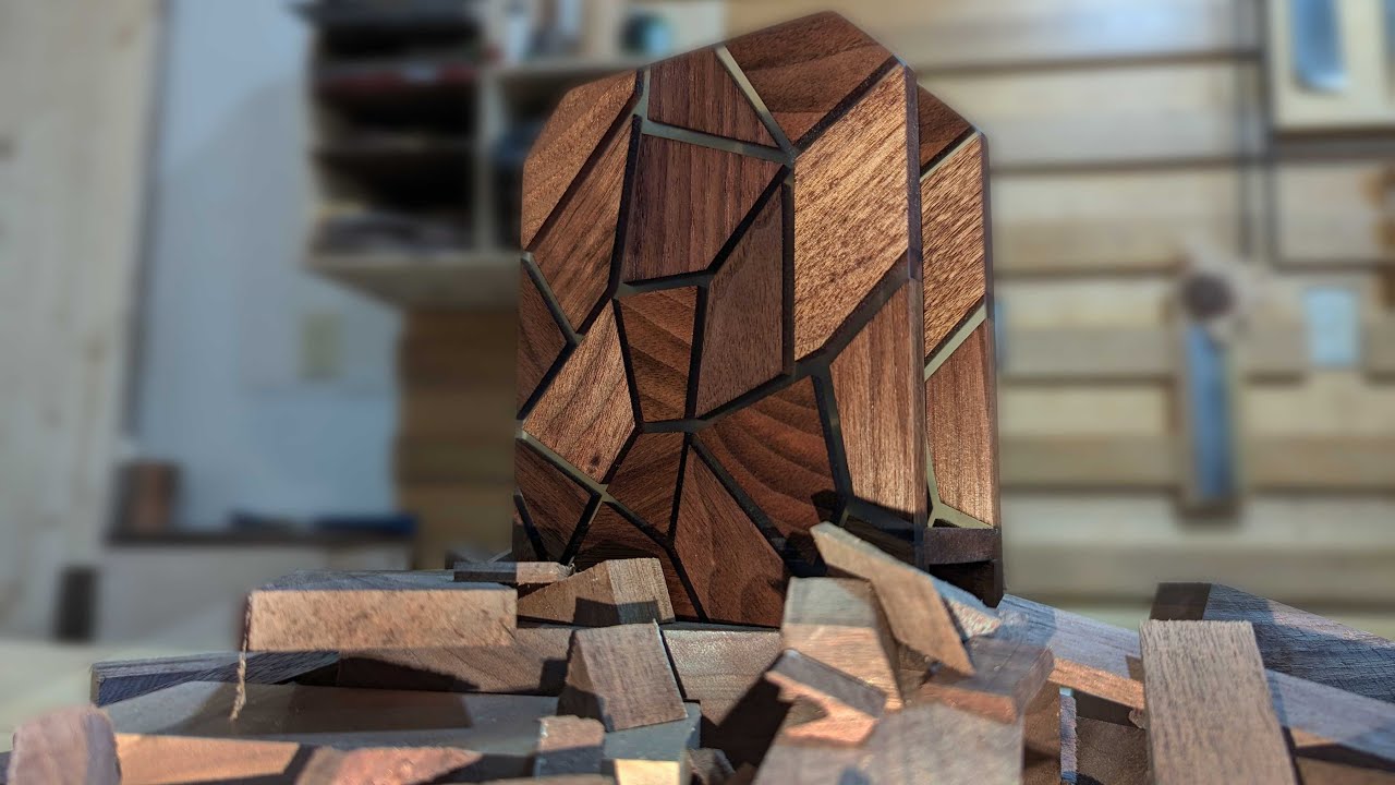 Caleb takes this pile of scrap and uses it as the foundation for a custom napkin holder. Instead of cutting from full boards, he embraces the unique sizes, shapes, and grain patterns already present in his materials.