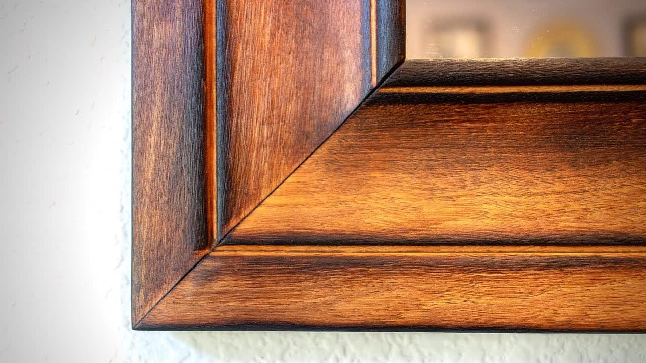 Jodee took a salvaged mirror and repurposed its wooden frame by stripping paint, applying a controlled flame to patina the surface, and sealing the result for a warm, aged look.