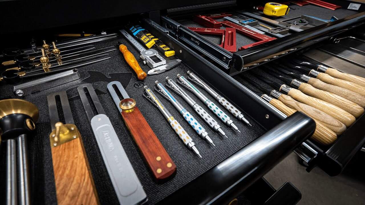 Shallow drawers near the top are dedicated to layout and measuring tools so squares, rules, pencils, and gauges stay flat and visible for quick access.