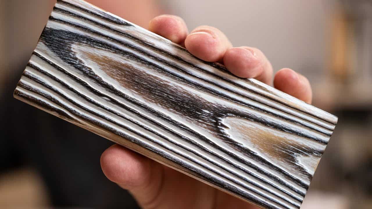 The core idea is simple: char the surface to blacken the hard grain, brush back into the softer springwood to reveal raw wood, saturate with antique white stain, and then selectively remove the top layer so white remains in the valleys.